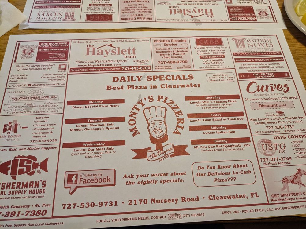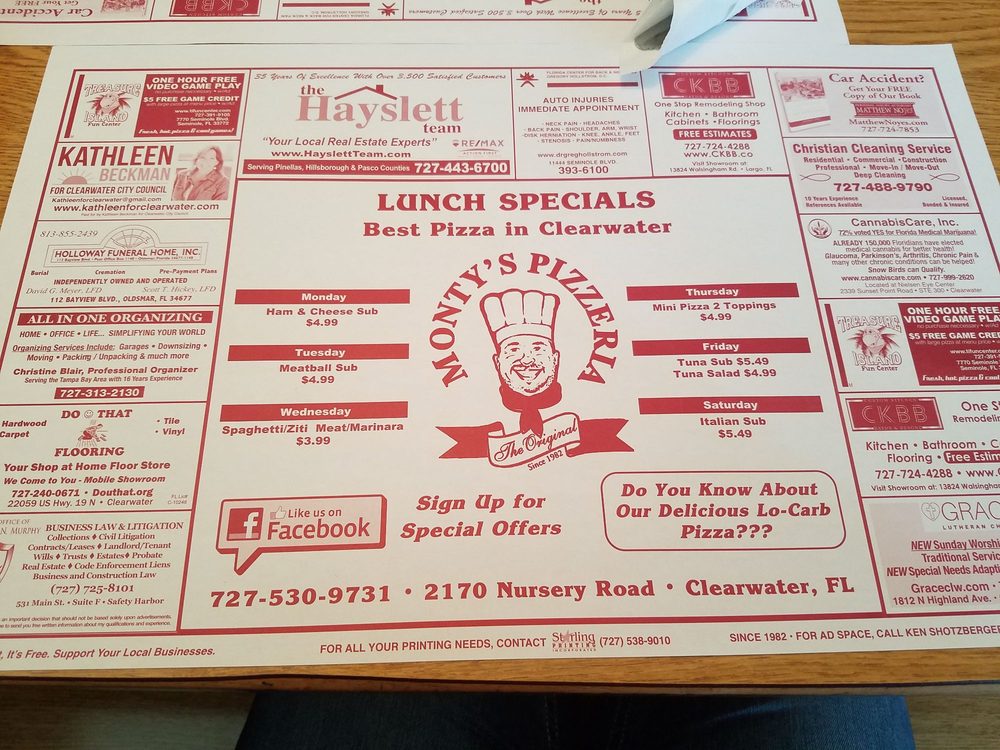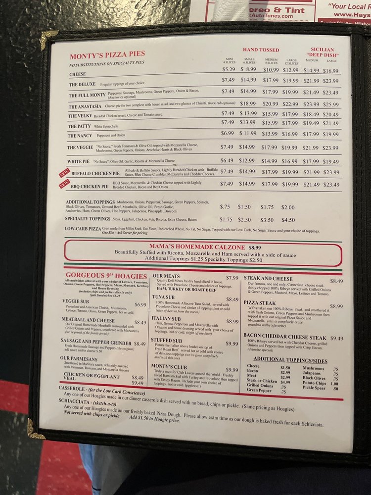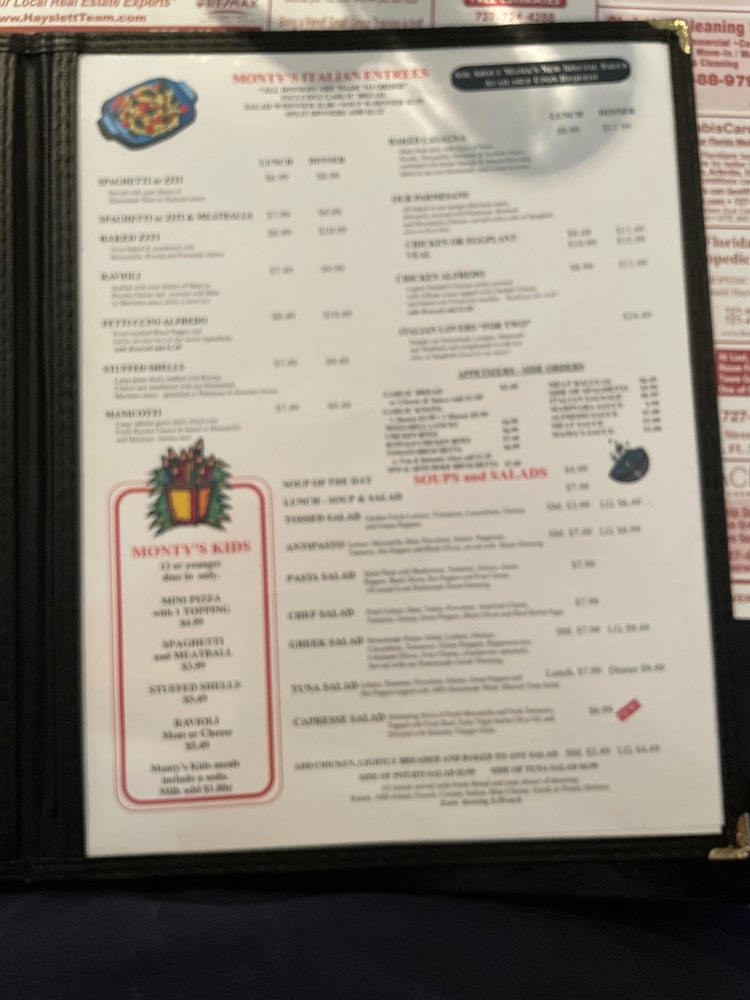 Introducing the menu at Monty's Pizza in Clearwater, FL, a longstanding family-owned restaurant known for its delicious pizza and Italian specialties. Customers rave about the crispy crust and generous toppings, with options like the Sicilian pizza and hot Italian hoagie standing out. The casual atmosphere, fast service, and variety of dishes make it a great spot for lunch or dinner. With a menu offering subs, pasta, and more, there's something for everyone at Monty's. Don't miss out on the patty pizza, a crowd favorite that's described as perfection. Whether dining in or taking out, Monty's Pizza is a must-visit for those craving a taste of authentic Italian cuisine.